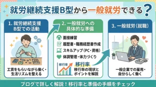 体調やメンタルの安定を優先して、ご自身のペースで通える事業所を選んだものの、ネットや周囲から「B型から一般就労はハードルが高い」といった声を聞くたびに、将来を悲観してしまうこともあるかもしれませんね。決して、無理をする必要はありません。結論...
